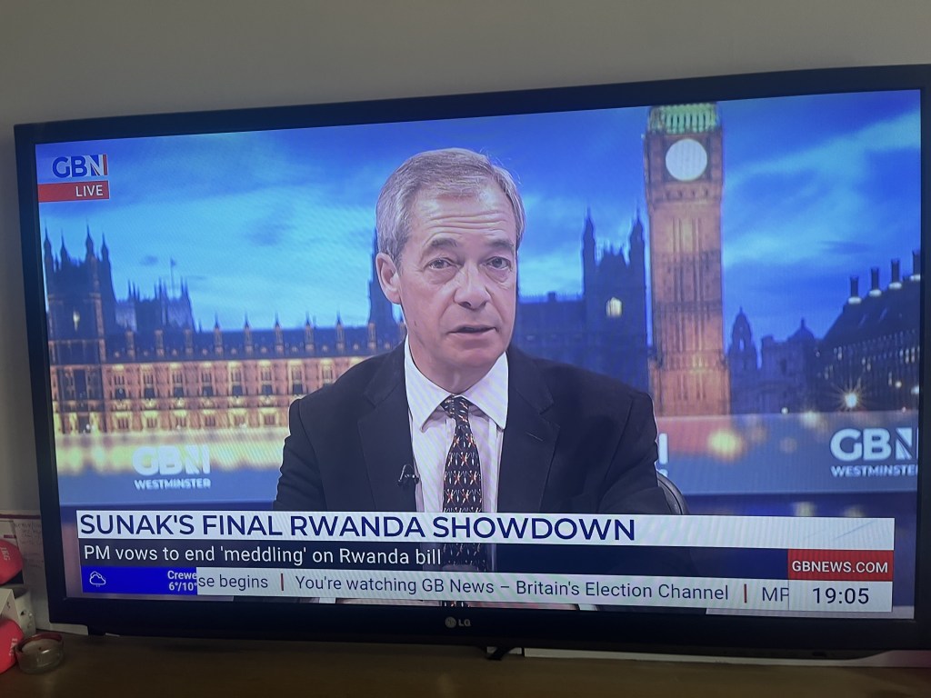 To look ahead at what might be possible I first monitored his current output for a fortnight . Farage regularly echoed Reform UK’s attacks on Rishi Sunak’s ‘Brexit failures’ asking viewers ‘why do we believe a word they say’. For the past two nights Farage has quoted from what he calls his ‘Rwanda Files’, apparently leaked documents from the Home Office. He says that Sunak ‘wilfully deceived the nation’ over ‘Stop the Boats’ when he said in March last year that under the Illegal Immigration Bill immigrants on boats would be removed from the UK ‘within weeks’. Farage says the Home Office knew that couldn’t happen. After his first attack there was no coverage on his programme of any response from the Prime Minister or the Home Office, the second night saw a one paragraph quote from the Home Office.